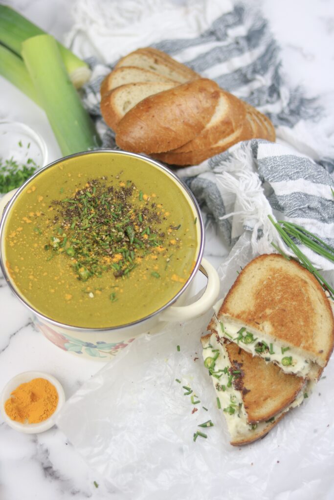 Turmeric Potato Leek Soup | Chili Chive Grilled Cheese